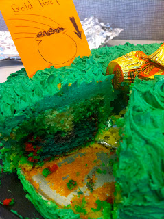 4. Now this is where I had to make major adjustments. The point of this cake is to lure a leprechaun to your cake so that when he goes for the gold in the center he falls into the hole at the center of the bundt pan. Sadly, I don't have a bundt pan so I had to make one out of a circle pan. I folded aluminum foil into a circular shape at the center of the pan and poured around it. But this worked out quite nicely so I recommend it for anyone else who doesn't have a bundt pan.